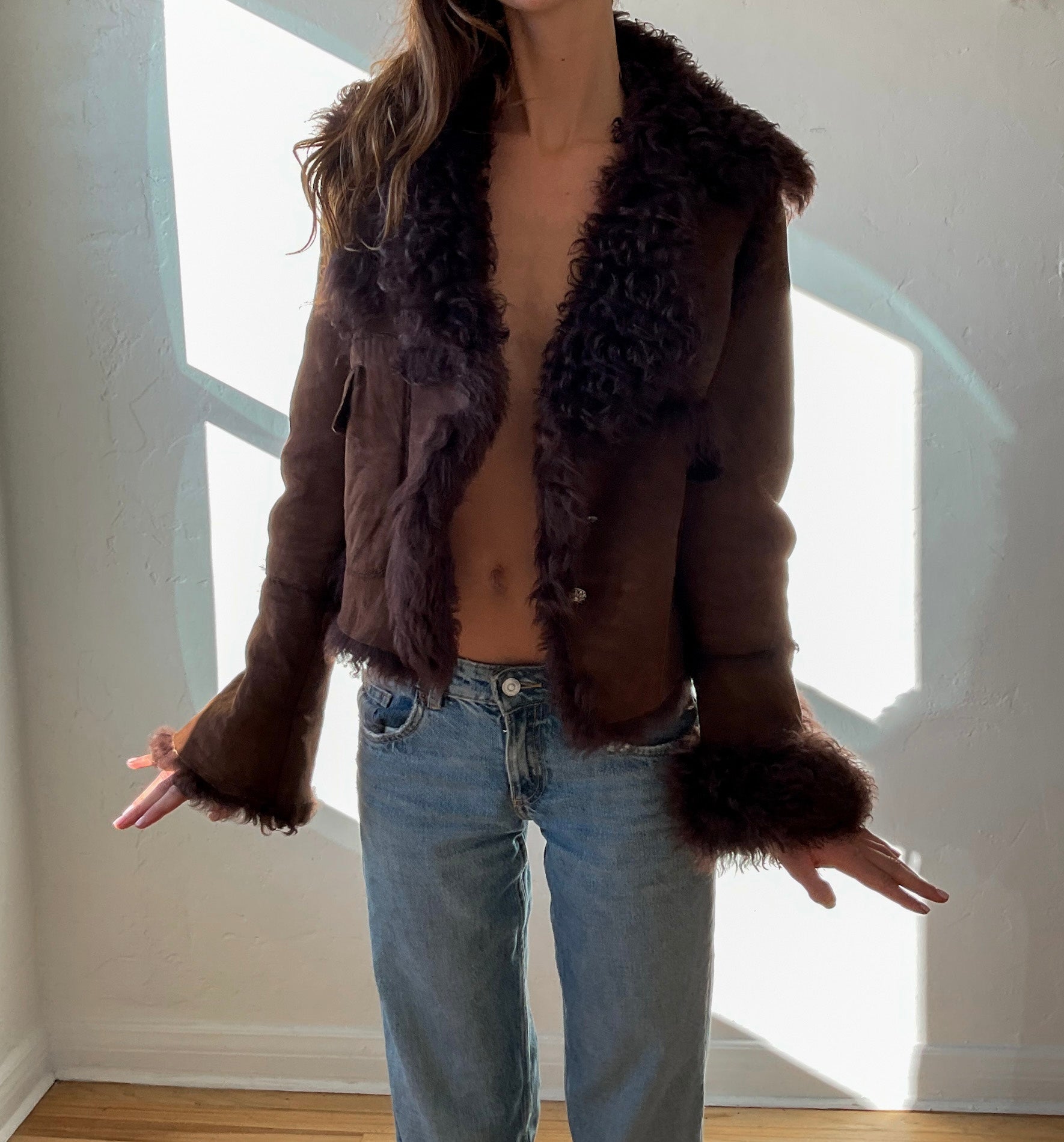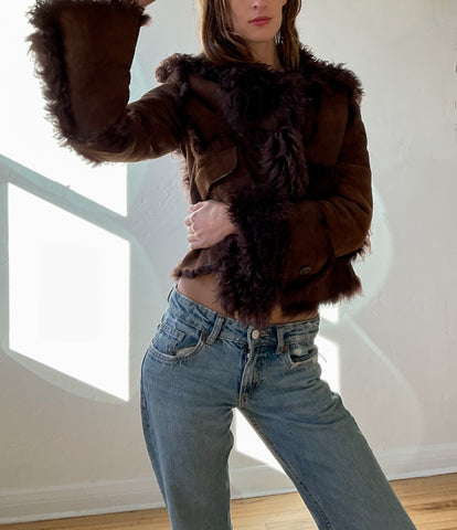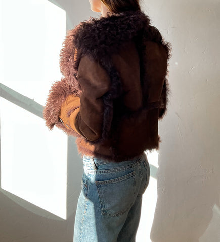 1970s rare brown shearling penny lane suede cropped coat with custom mismatched buttons. Handmade, no brand label.