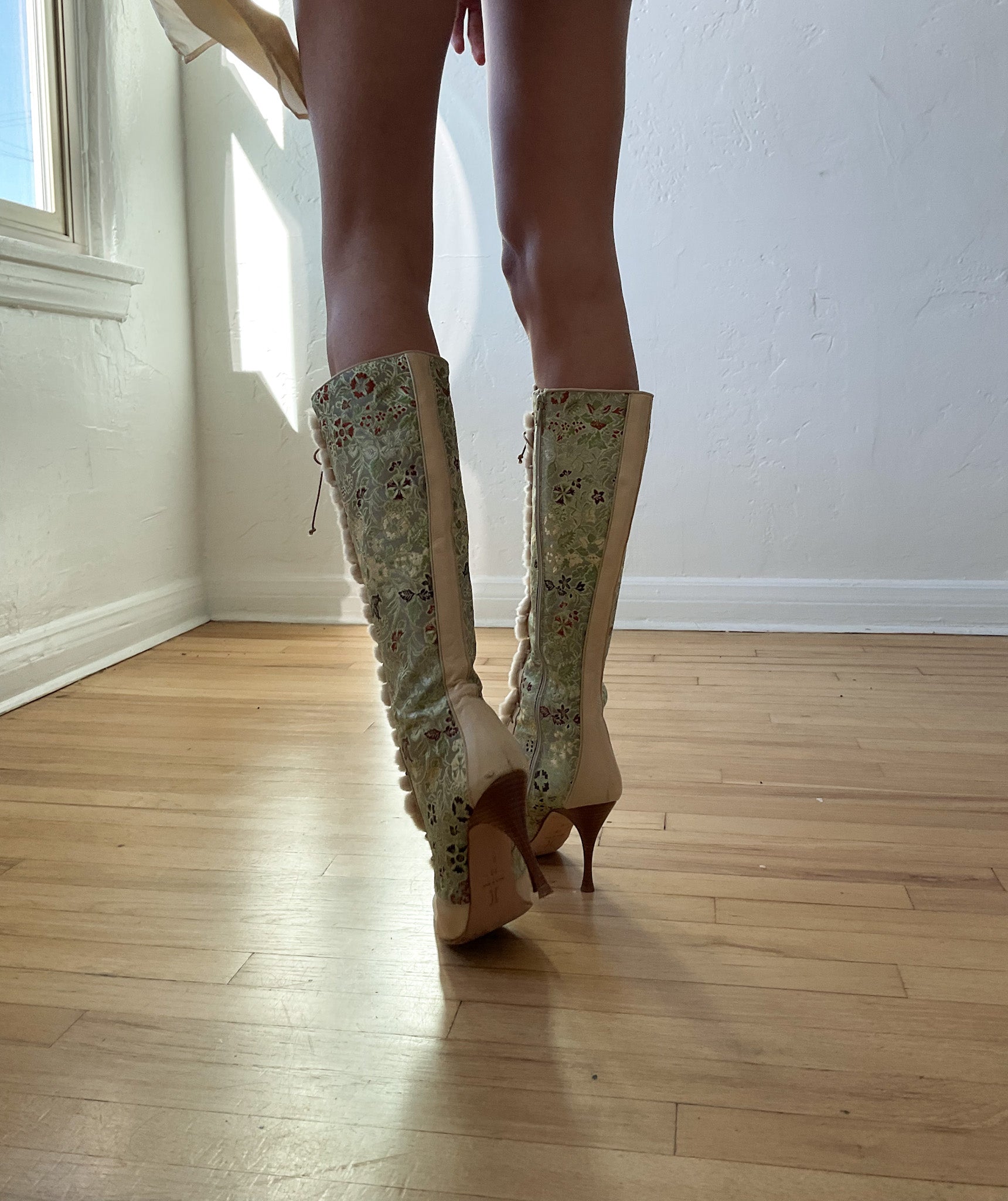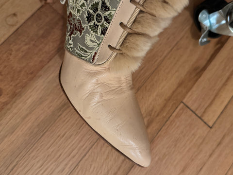 Vintage floral tapestry Cole Haan knee-high boots featuring a lace-up front and pointed toe, stiletto heel, and rabbit fur trim. Made in Italy.