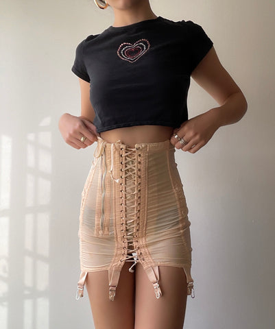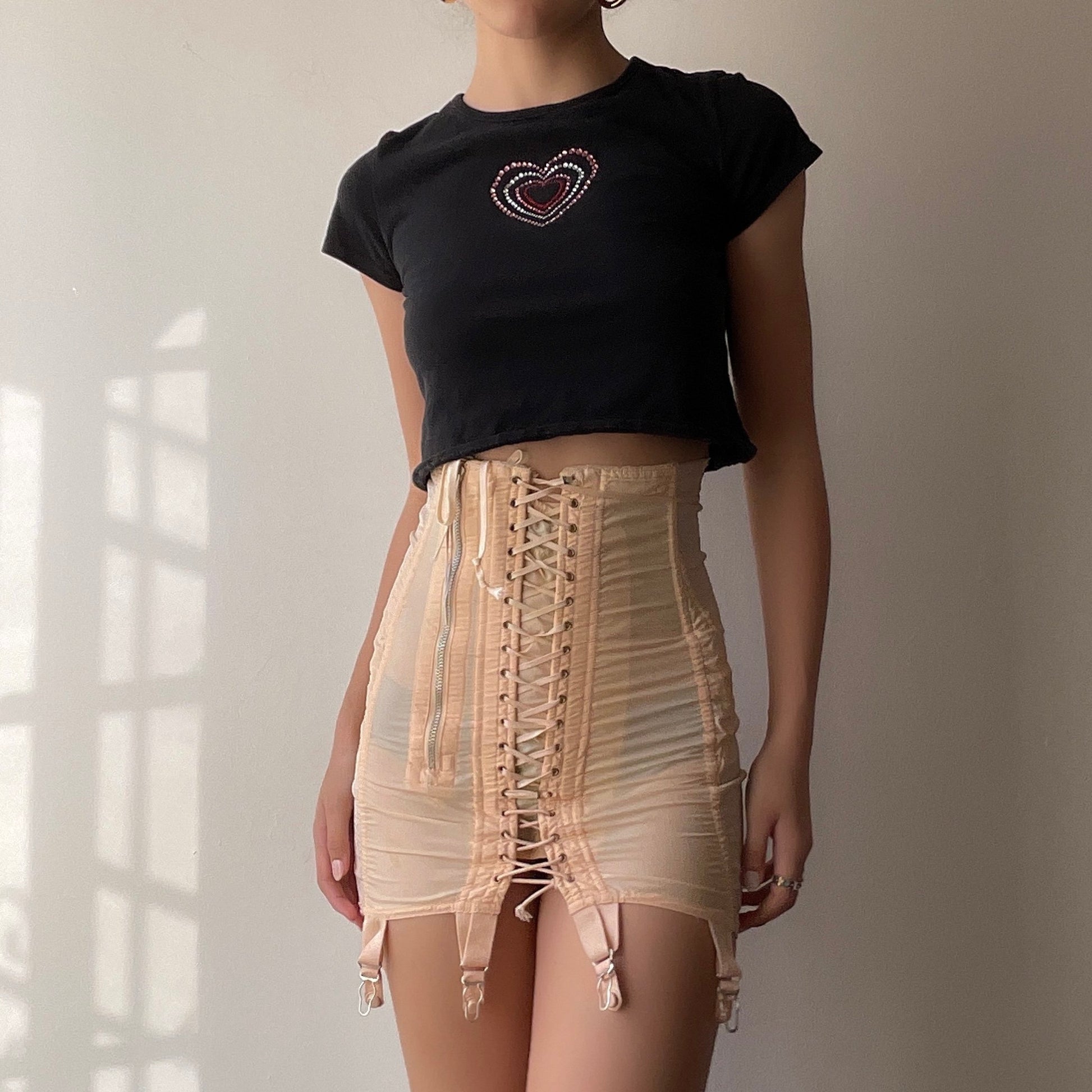 WOW. WOW. WOW. This is the most incredible vintage girdle skirt from circa the 1940s! (originally thought to be 60s, but after further research we have concluded it is from the 1940s) Gorgeous nylon-esque fabric - EXTREMELY RARE STYLE. Features an adjustable lace up front with a privacy panel and a zipper on the side. Has 6 garters!