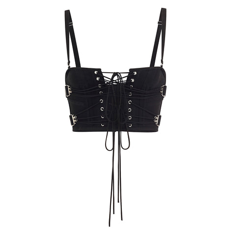Thoughtfully designed with a contemporary fit and a vintage affectation. Period-accurate details like the fan lacing and quintuplet side buckles ornament the modern crop. Features metal snap fasteners for simple on-and-off as well as four fully adjustable side-straps to accentuate the waist and bust however you see fit. If desired, the corset may be worn at the waist by removing the adjustable shoulder straps.