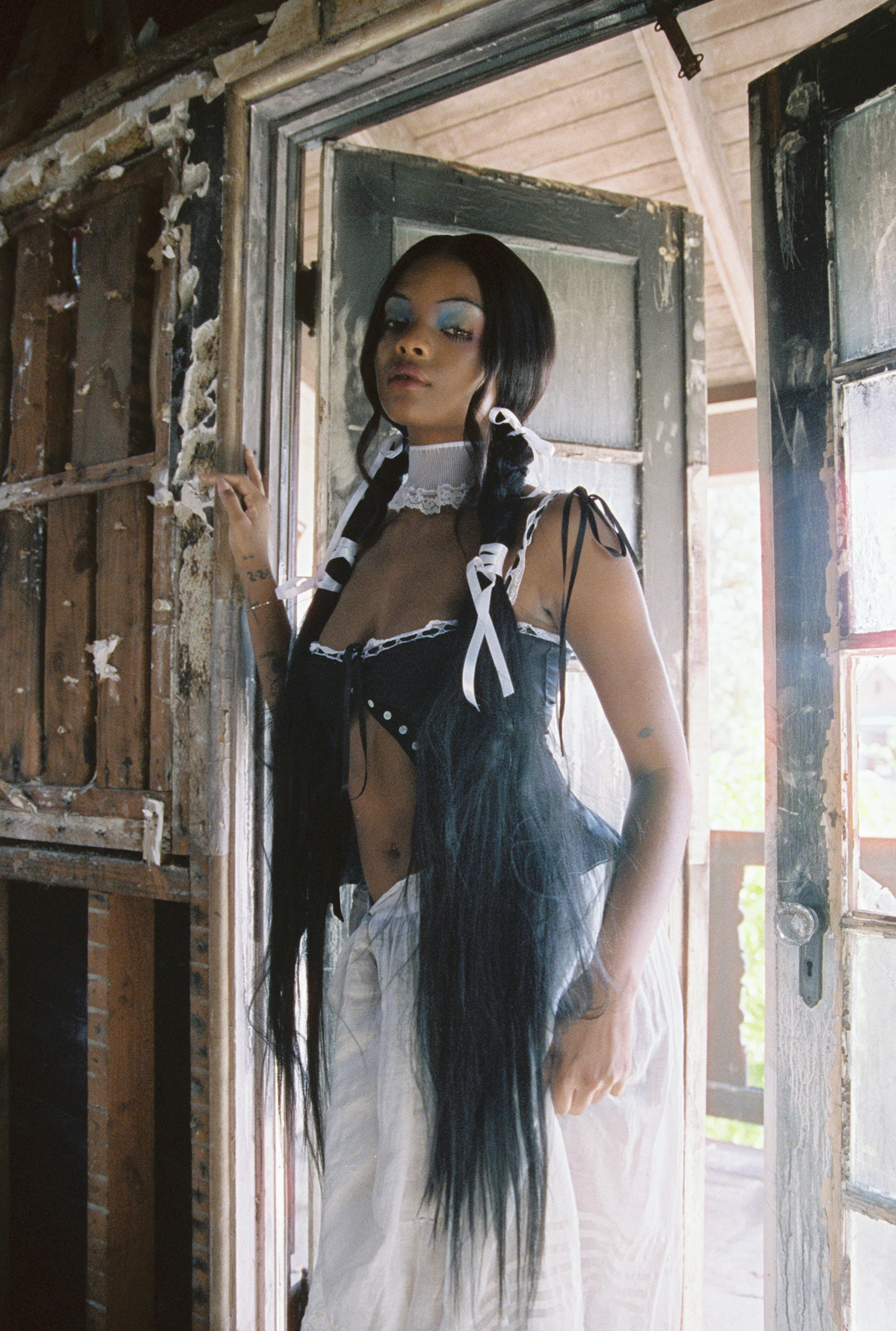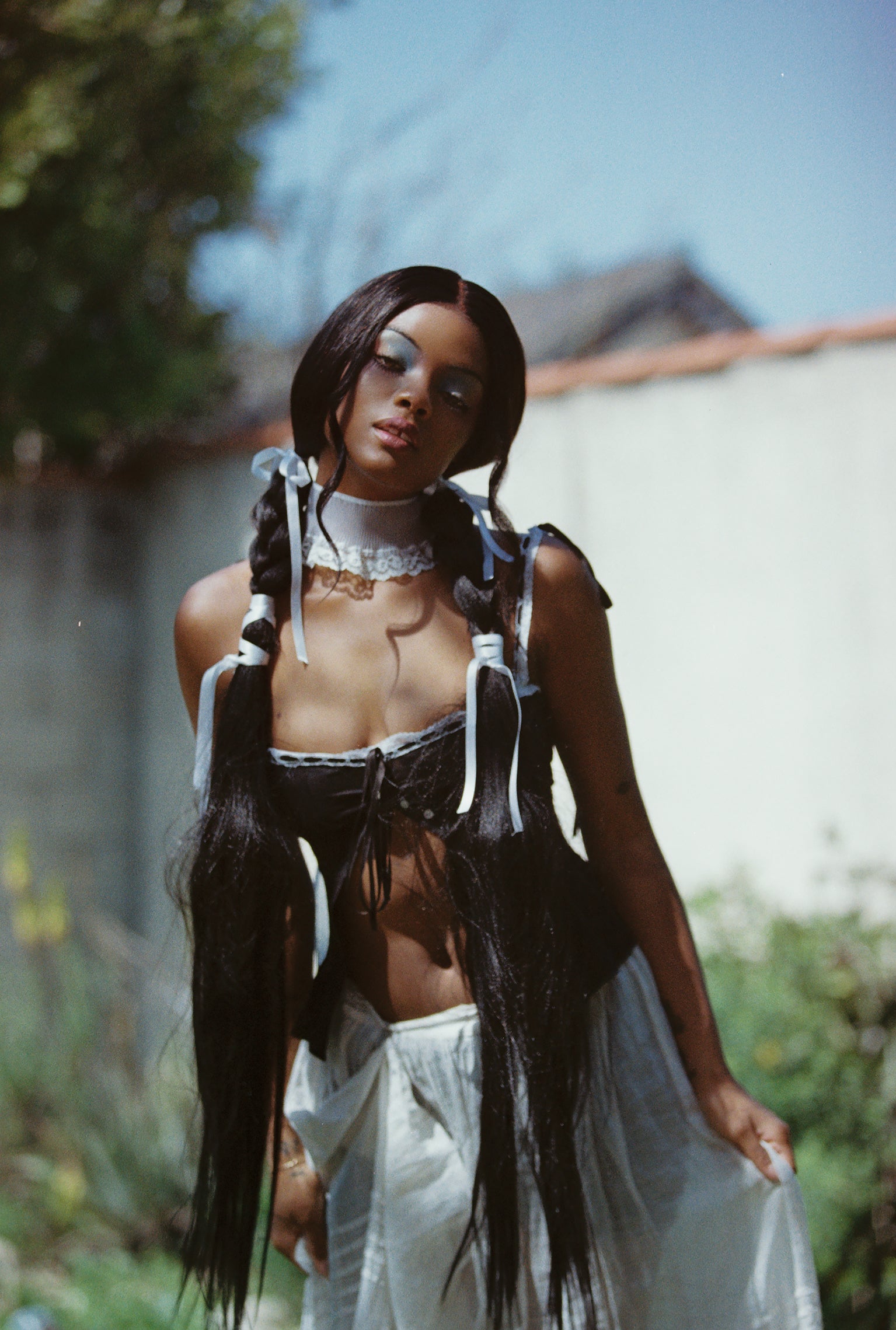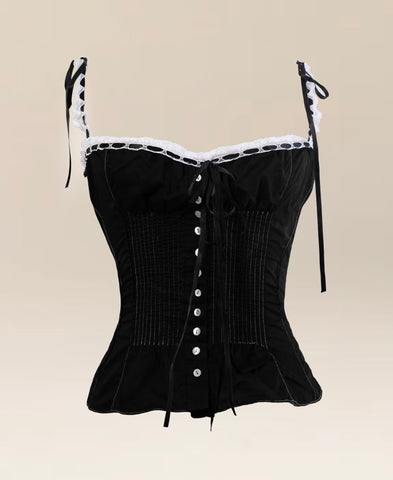 Crafted with pure noir cotton and a contrasting white baroque French Valenciennes lace. Black silk ribbons amble down the shoulders and through the neckline. Delicate contrast stitch micro-pleats gently cinch the waist without the need for traditional boning, making this top effortlessly wearable. Finished with front-set shell buttons for easy on and off.
