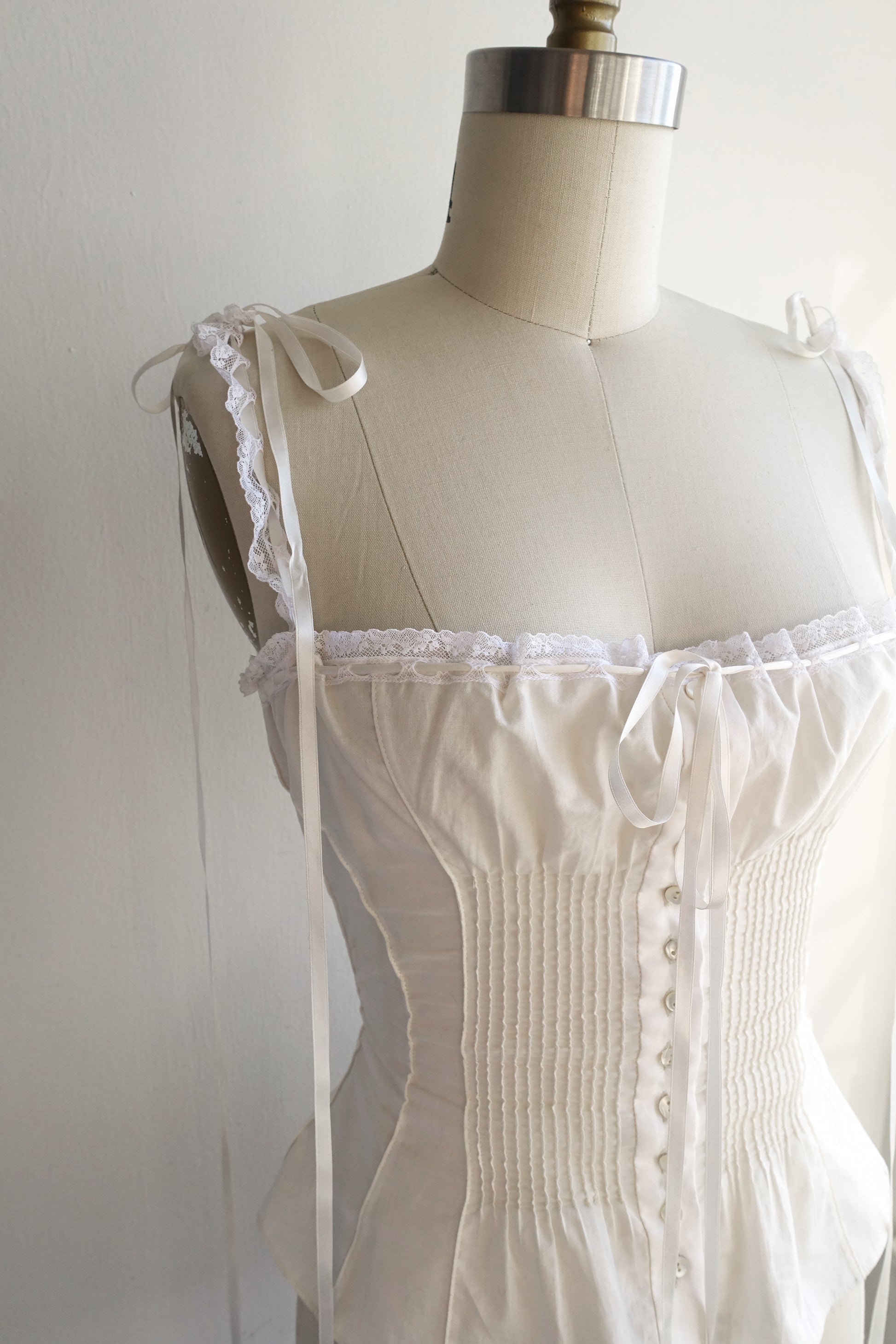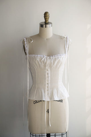 Crafted with pure ecru cotton and a baroque French Valenciennes lace. Custom silk ribbons with the color of your choice amble down the shoulders and through the neckline. Delicate micro-pleats gently cinch the waist without the need for traditional boning, making this top effortlessly wearable. Finished with front-set shell buttons for easy on and off.
